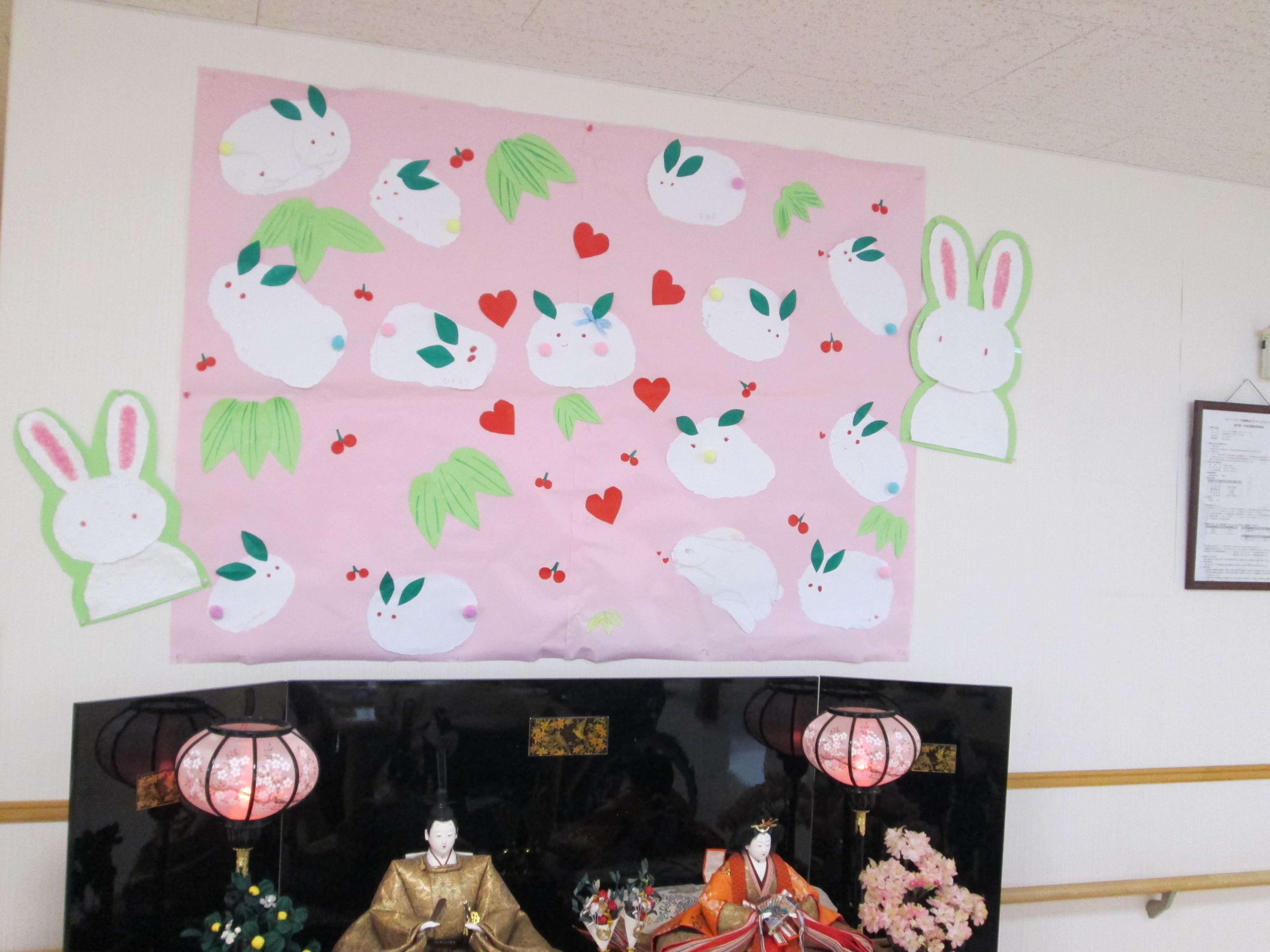 今年も利用者様が制作した雪うさぎの壁飾りの下で存在感があります!!