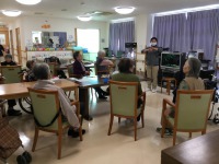 今日は昼食前の体操で、皆さん一緒に首を真上に向けたり、指の体操や肩の上げ下げなどで体をほぐしていました。