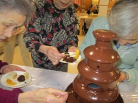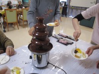 チョコフォンデュでは、定番のバナナ、パン、オレンジなどを皆さん楽しそうにチョイスして