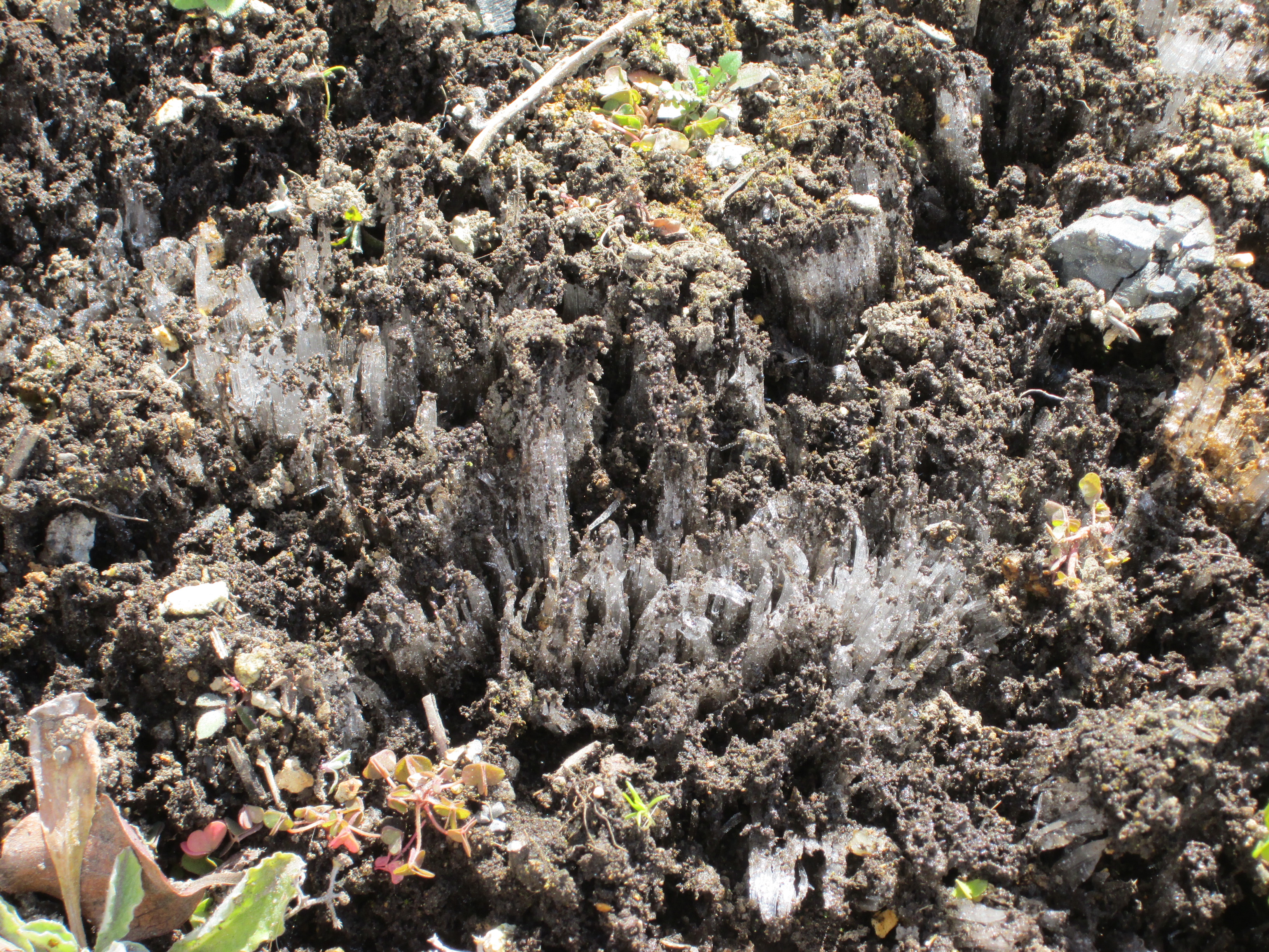 霜柱の間から顔を出す福寿草を発見しました。