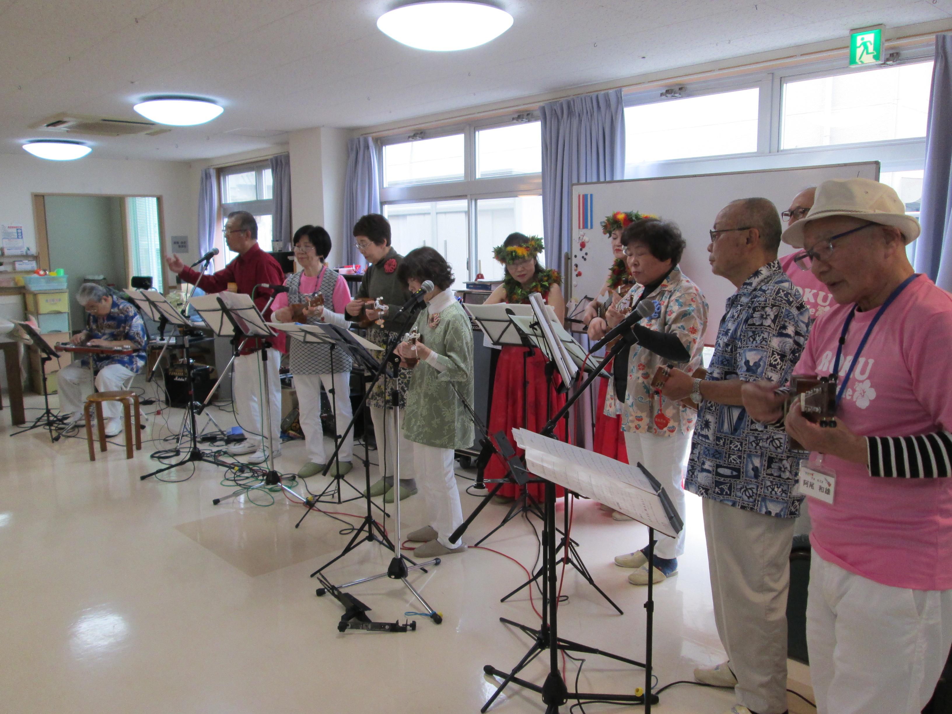 デイサービスに、初めて「しきしまウクレレクラブ」の皆様が慰問に来てくださいました。