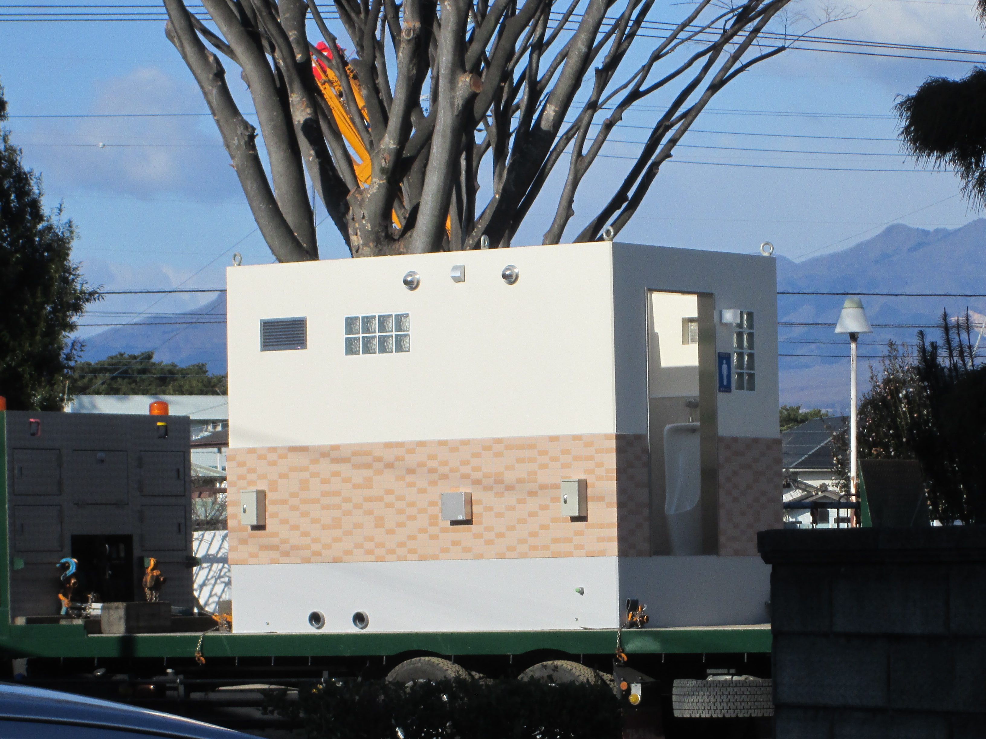 今朝早くから、大きなダンプカーがプレハブの立派なトイレを搬入しています。