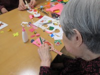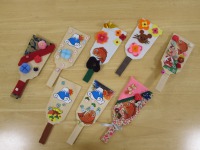 まっさらの羽子板に、切り絵や布の小物を張り付けて、一人ひとり個性のある羽子板が仕上がりました。