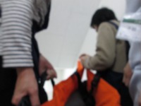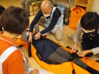 簡易担架での移動も実際に行いました。