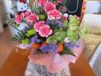 先ほどお花屋さんに届けていただいた、今月のフラワーアレンジメントですが・・・