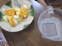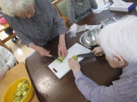 今日のデイサービス料理教室では、りんご、さつまいも、柿を小さく切りそこへクリームチーズを混ぜた、季節の果物の盛り合わせを作りました。