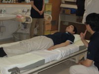 午後からはベッドや車イスを使用してケアの実施方法など実技を学んでいます。