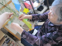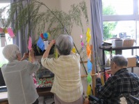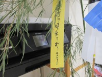デイサービスのみなさまが、利用者様のご自宅からいただいた笹に、七夕飾りとねがいごとを着けていました。