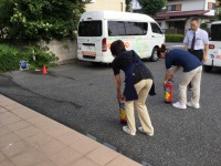 また、水消火器を用意していただき火災が起こってしまった場合の消火方法も実践を交えて確認しました。