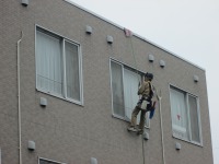屋外も屋上からロープで下がり3階、2階と掃除しています。