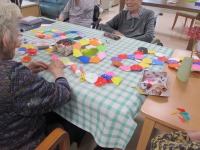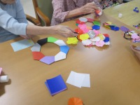 デイサービスでは、折り紙で可愛らしい花のリースを作っていました。