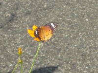 玄関のコスモスにアゲハ蝶が羽を伸ばし休んでいました。
