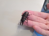 カブトムシと小さなくわがたがケースの中から外へ飛び出そうと必死にもがいていました。