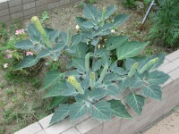 玄関脇の花壇に植えてあるエンジェルトランペット、俗名トランペットフラワーが大きく育っています。