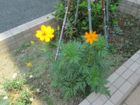 暑さのため、トランペットのような花はしぼんでいますが周囲の花々を木陰にしてくれています。