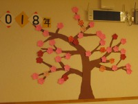 12月はクリスマスツリー、1月は絵馬と、2階・3階の共有スペースの壁面を彩ってくれましたが、2月はパッと梅?桃?の花が咲いていました!!