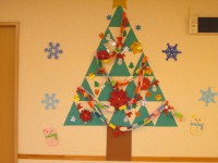 殺風景な2階、3階の壁面に職員と入居者様の共同作業で、華やかなクリスマスツリーが出来上がりました!!