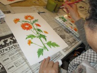 デイサービス、本日の水彩画教室はスプレー菊の作品を仕上げていました。