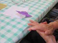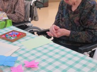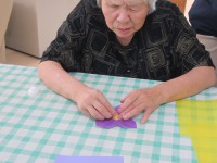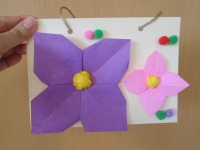 今日のデイサービスでは、『すみれ』の花の小さなタペストリーを作りました。