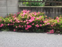施設駐車場の縁沿いに、低木のつつじの木が植えられています。