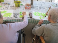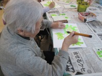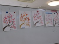 デイサービスの水彩画教室では、色とりどりの梅の花が咲き誇っていました。
