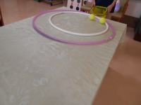 テーブルの上にフラフープを置き、その中をめがけてボールを転がします。