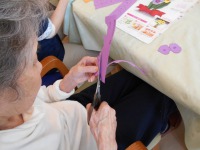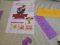 デイサービスでは、色紙を使って春色のパンジーを作りました。
