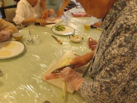 包丁持つ手の動きの速いことに驚きます。若いスタッフは切り方などを教えていただきながら作りました。
