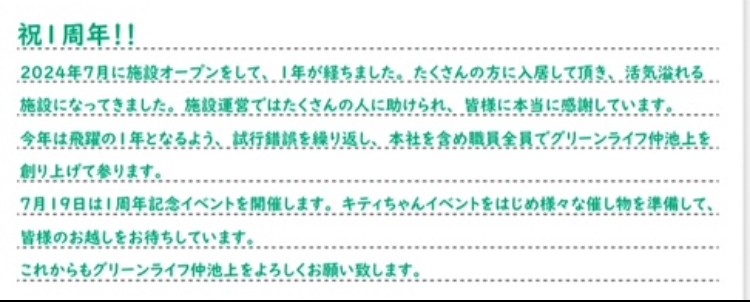 この7/1にオープン1周年を迎え㊗、施設長からの一年間分の皆様への感謝と、更なる飛躍の想いも掲載させていただいております…。
