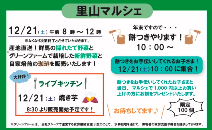 ご好評いただいておりますマルシェは、12/21(土)8:00~が今年の締めくくりとなります。