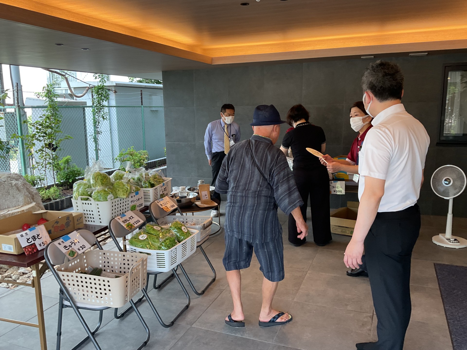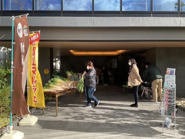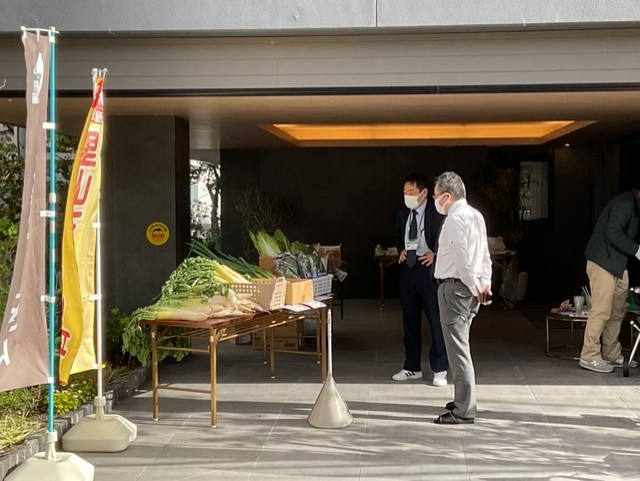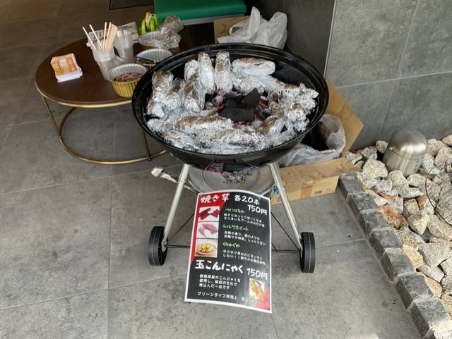群馬県から直送の新鮮野菜、ライブキッチンでは焼いも・玉こんにゃくをご提供しました。