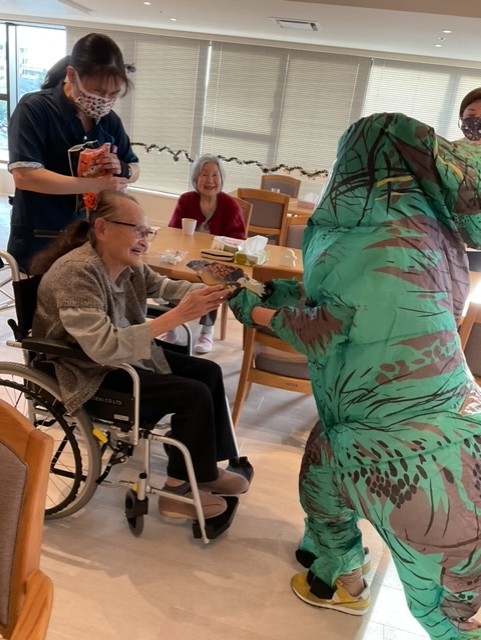 そして、入居者様がご生活しているフロアーに上がってもらい、入居者様からお礼の駄菓子がプレゼントされました。