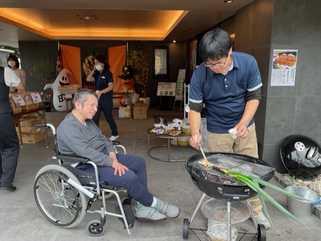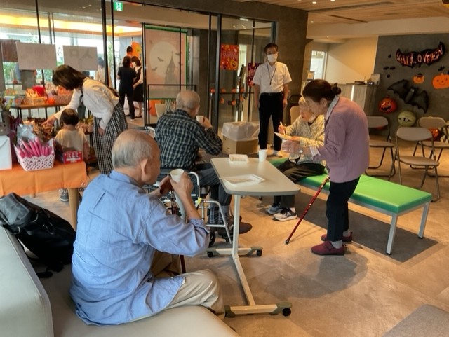 昨日、第4弾の里山マルシェを開催しましたが、入居されている方々にも居室フロアーから下りてきていただき参加されました。