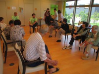 14名様が参加され、デイサービス所長と理学療法士による転倒しないための運動を皆さんで行いました。足の指先でタオルをたぐり寄せる運動、ペアになって足裏を合わせて動かす運動や肩を借りて太ももを前後左右に動かす運動など。わいわい楽しい雰囲気の中で楽しんで運動されていました。