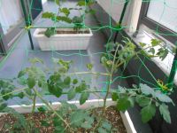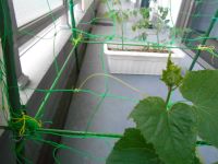 お昼に支柱を立てて、写真を撮ったのは16時なのですが、すでにキュウリの蔓がネットに絡みついていました。