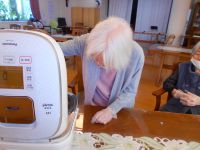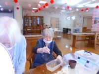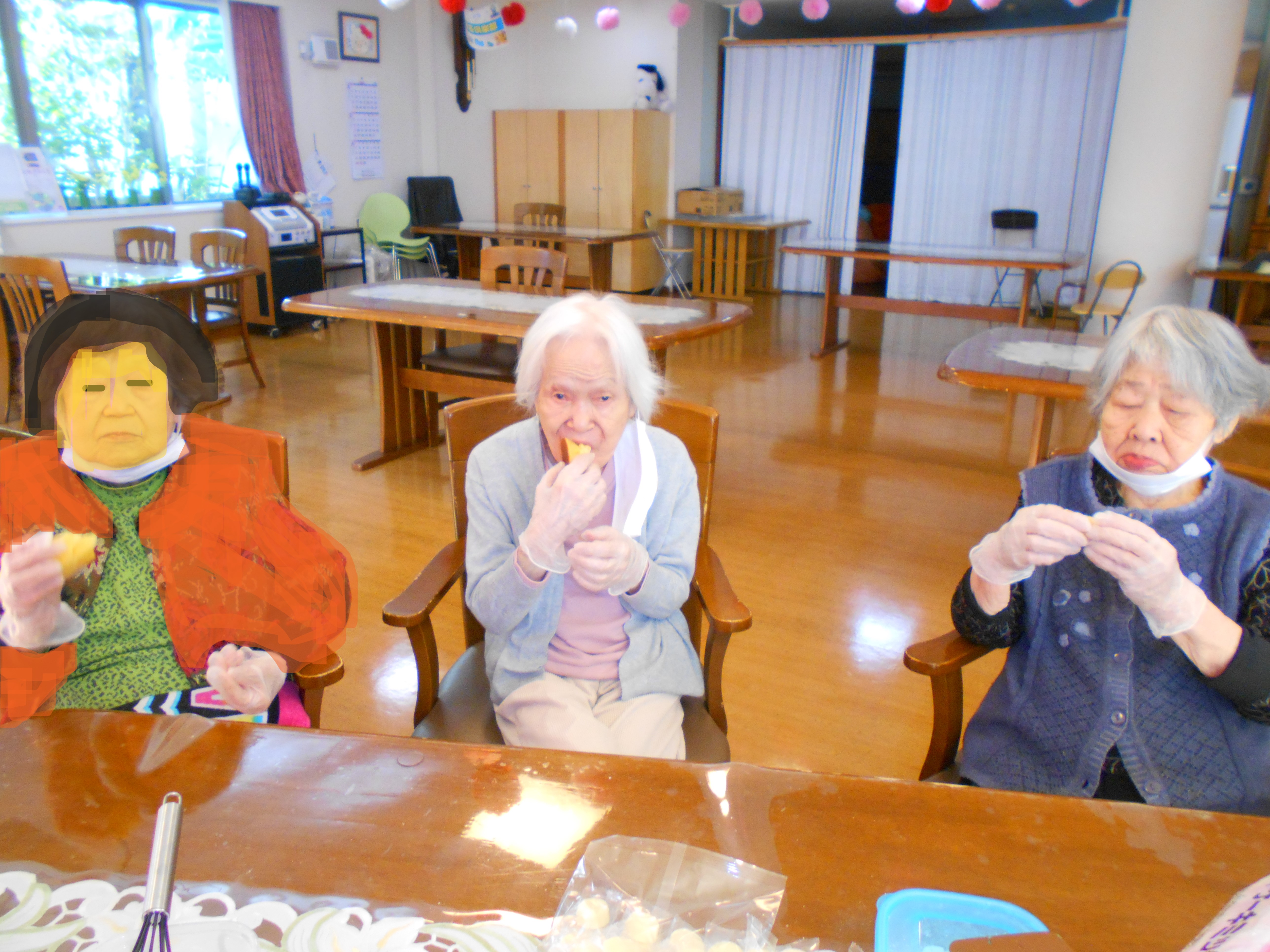本当は、おやつレクは明日行う予定なのですが、相談員の予定が入ってしまっていることから、急遽本日行うことにしましたが、普段参加して頂ける方がお風呂で、ちょっと疲れちゃうから今日はお休みと言われ相談員が一人で作っていたのですが、見かねて3人のご入居様が入浴後に手伝って下さいました。