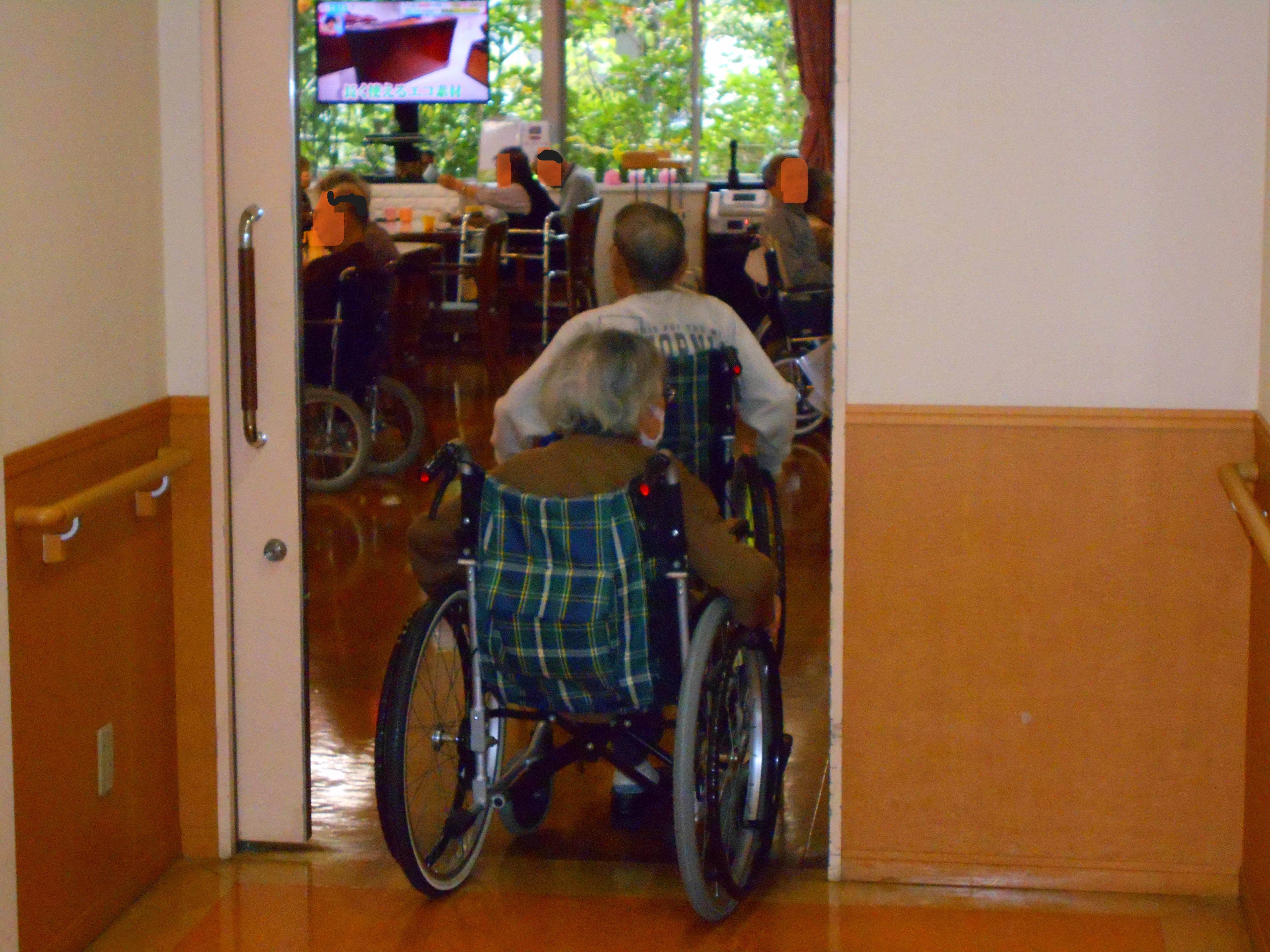 ご自分で車椅子を動かすことが出来たり、何か補助具を使えば歩ける方はご自身で自分の席まで頑張って頂きます。
