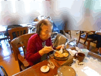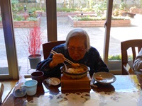 そして、かつ丼を食べている男性(90代後半)に「〇〇さん、その歳でかつ丼を食べられるって