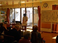 さて、本日は音楽療法の開催日で食堂に入居者様が集まり