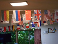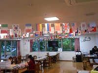 食堂部分には万国旗を飾り、施設内に案内ポスターを貼り