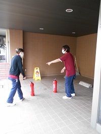 その後、職員による消化器の使用方法、消化器を使っての消火