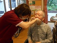 一緒に確認を行い事故のないように職員が口の中まで介助を行い