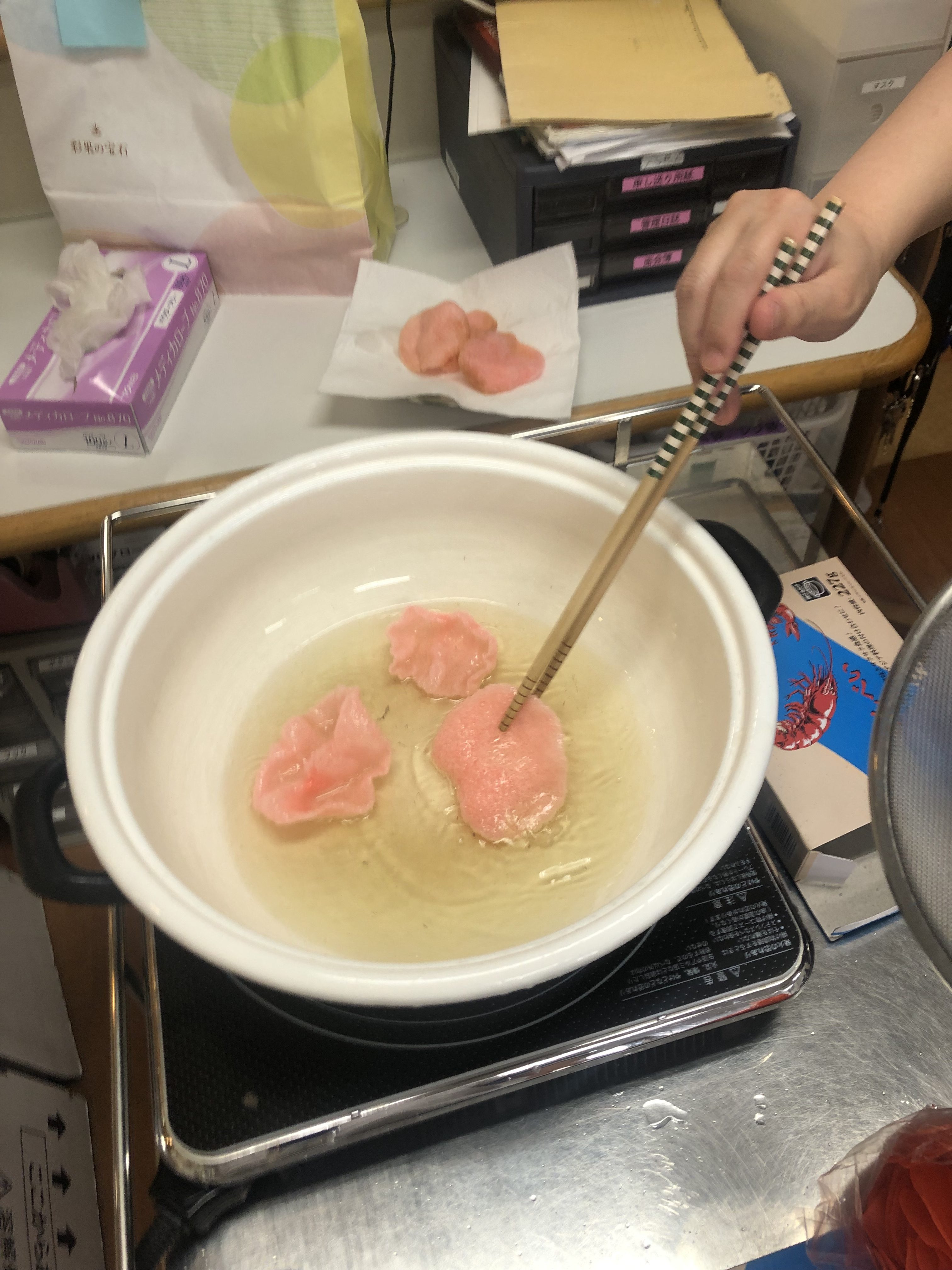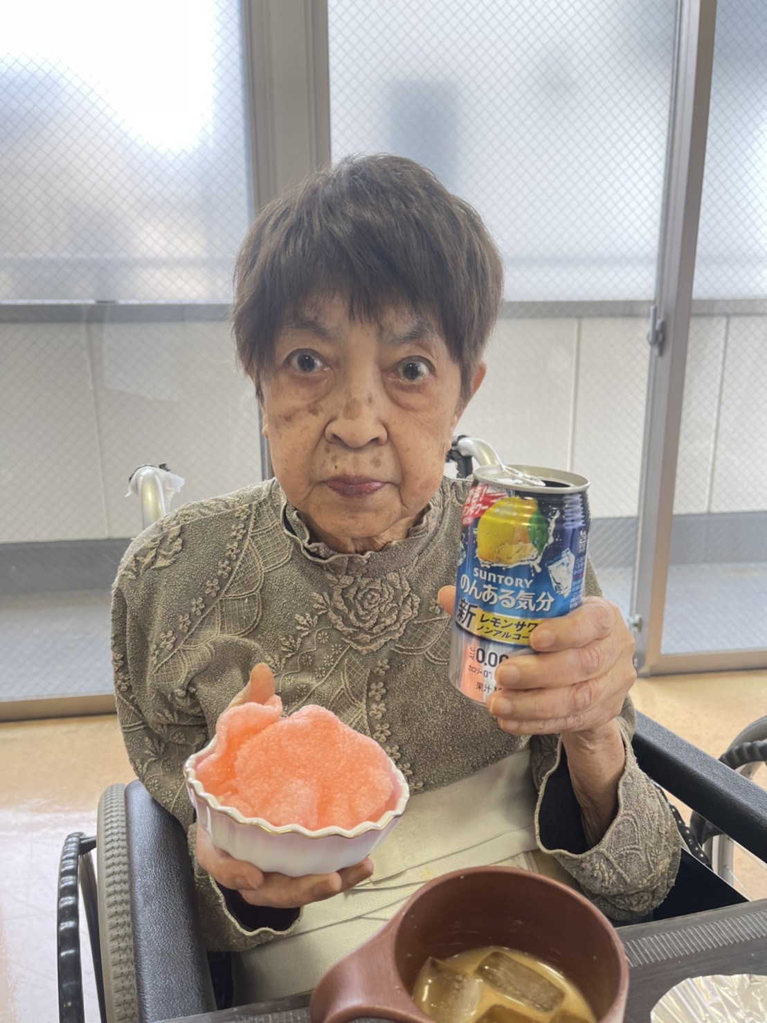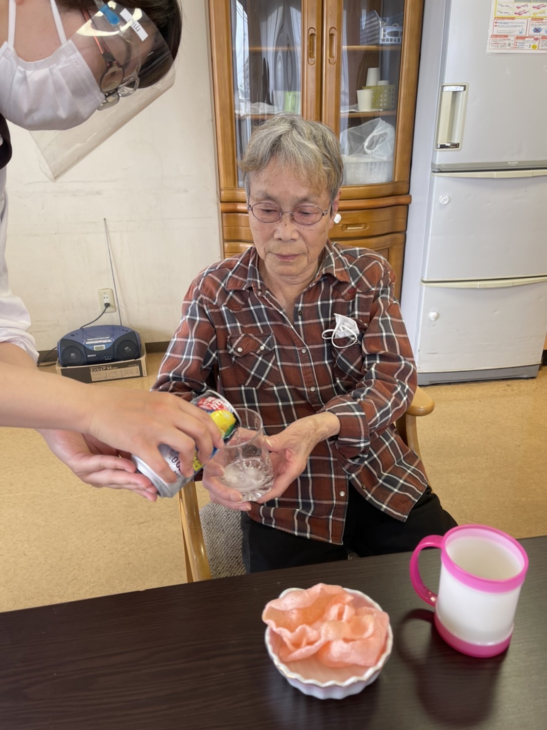 いつもの調理実習レクでは入居者様にも調理を手伝ってもらいますが、今日は油で揚げる作業でしたので看護師が女将さんになりきり、調理&お酌をさせていただきました(^^♪