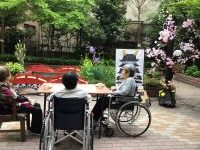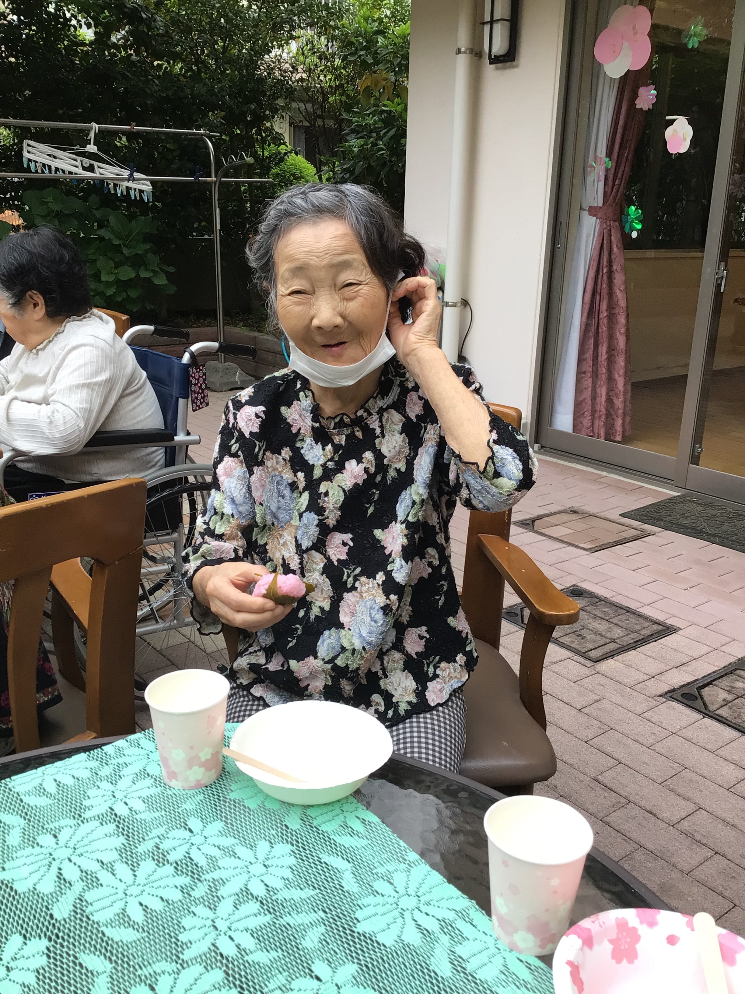 曇り空が残念でしたが、おやつ時には中庭で道明寺と桜茶を召し上がっていただきました。