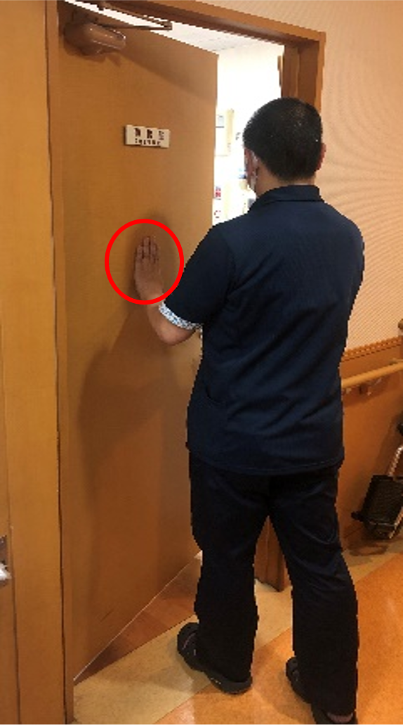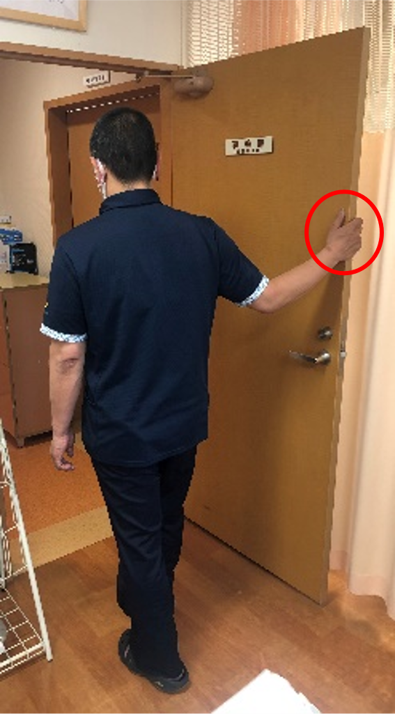 しかし、下記の写真のようにドアを開ける時にもう片方の手で扉を押し開けていませんか?