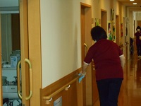 ※0.05% 以上の次亜塩素酸ナトリウムにて床・手摺等の消毒を行いま行います。