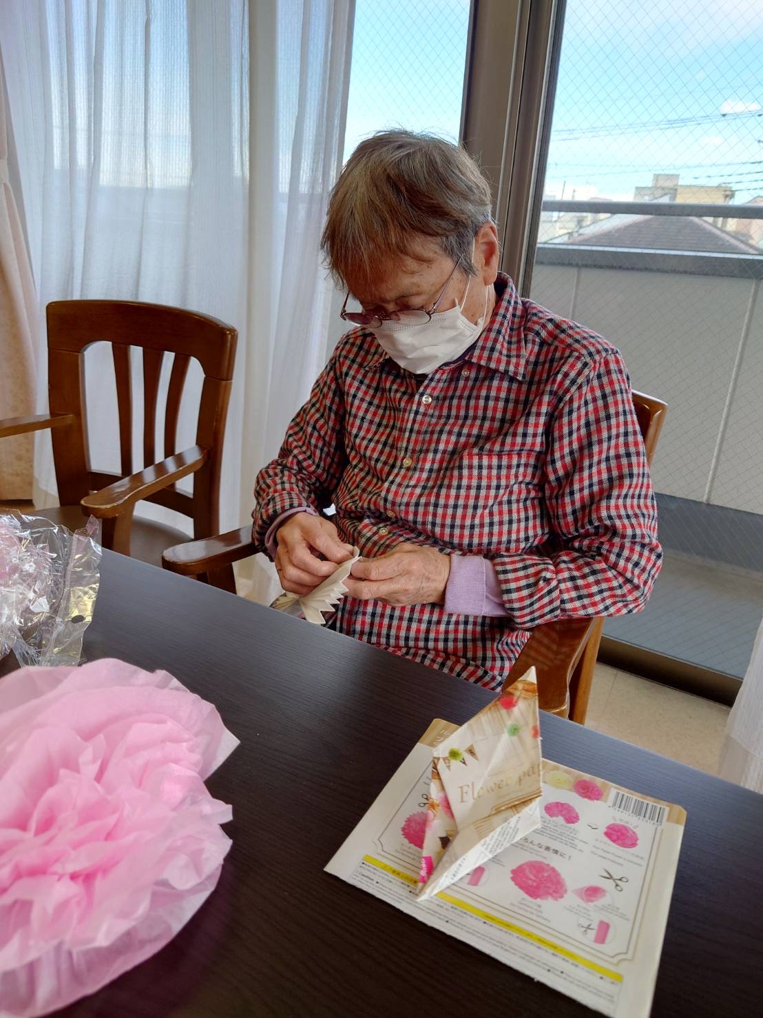 「飾りつけを入居者様に手伝ってもらってます!」とフロアから連絡があり、ワイワイと楽しんでやっているんだろうなぁ~と思いフロアへ行ってみると…。聞こえてくるのはTVの音のみ…