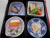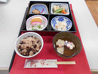 昼食には赤飯とおせち風料理が提供され、お正月感を