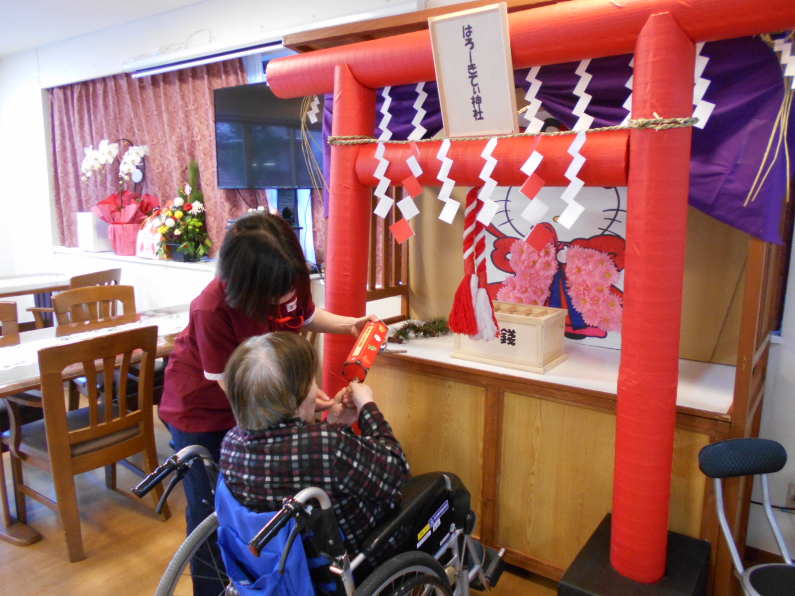 グリーンライフ草加では寝たきりの方、認知症の方、病気がちの方、すべての入居者様に初詣を楽しんでいただきたいと考え、毎年施設内に神社?を作成しお参りします!(^^)/