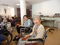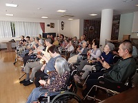 今日は、午前中はパンダ保育園の園児来ていましたが、午後からは、音楽療法で草加のアイドル小林先生による歌や体操がありました。初めて参加された時は、やや緊張されておりましたが、参加の回数を重ねるごとに自然と先生に近い場所で参加を希望される方が多く、最前列はプラチナ席となっております。(笑)